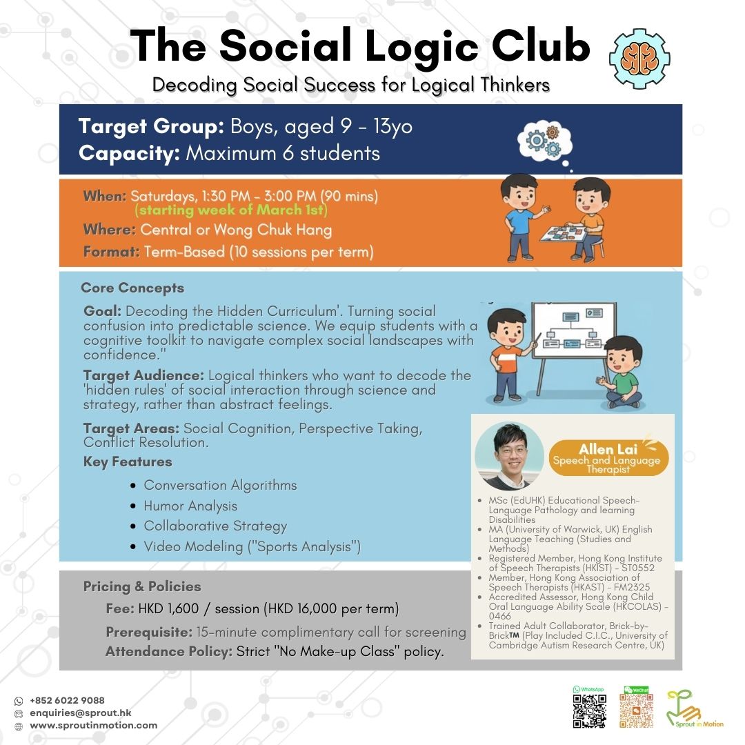 The Social Logic Club is a small-group social skills programme designed for boys aged 9–13 who think logically, analytically, and strategically—but find social interactions confusing, unpredictable, or exhausting.