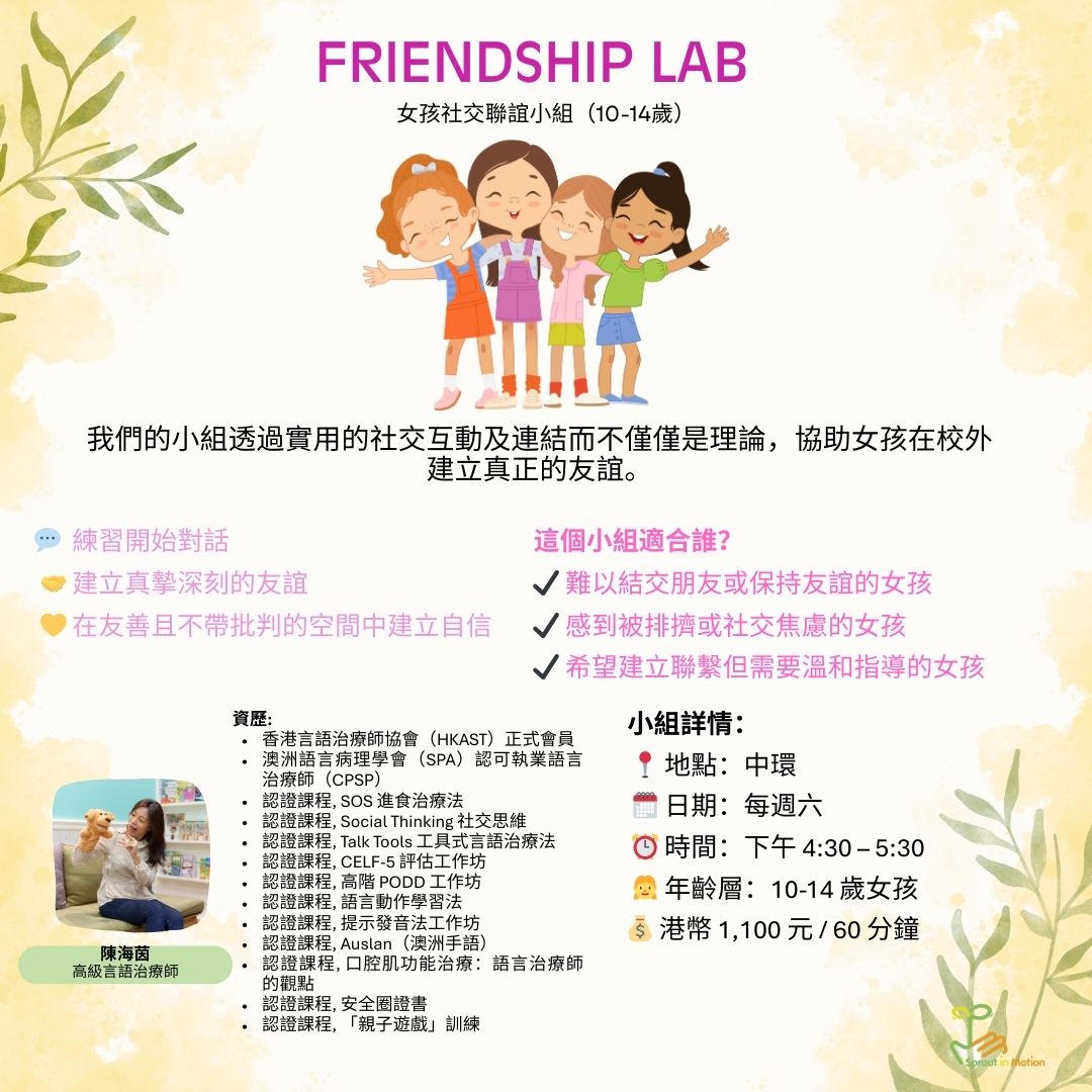 友誼工坊是一個小型互助的社交團體,旨在透過引導式的實踐體驗(而非說教),幫助女孩們在校外建立真正的友誼。