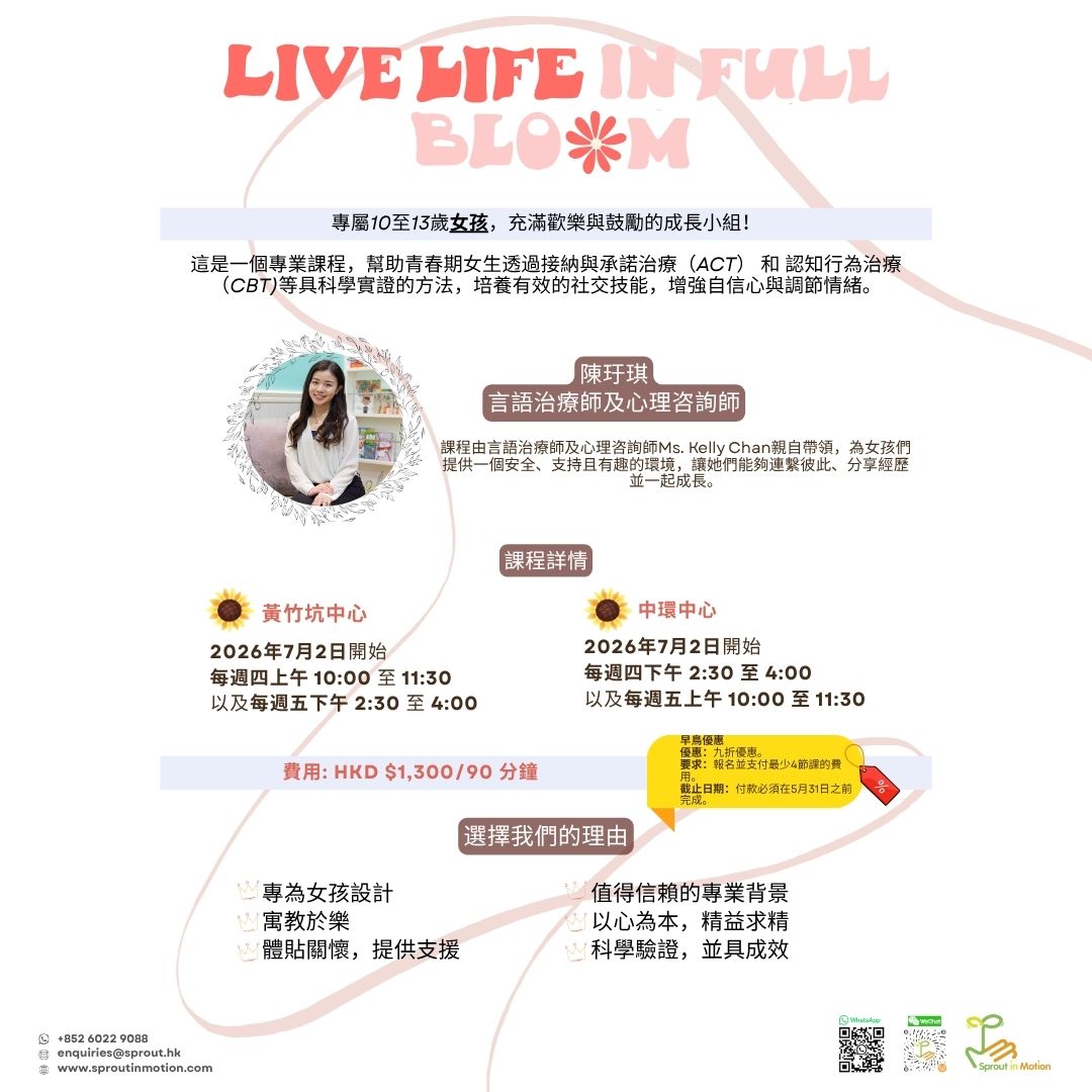 深受家長和參與者喜愛的「綻放人生」(Live in Full Bloom)旨在透過引人入勝、基於實證的活動,幫助青少年女孩建立情感韌性、自信心和有意義的友誼。
